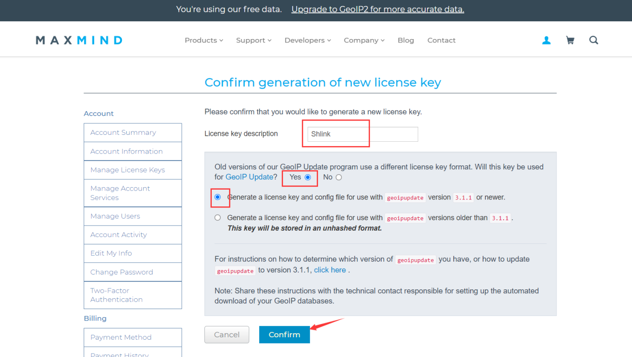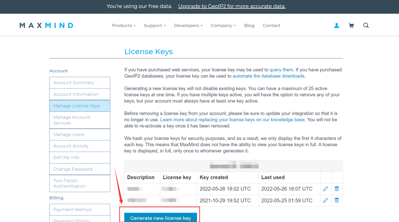 进入https://www.maxmind.com/en/accounts/current/license-key