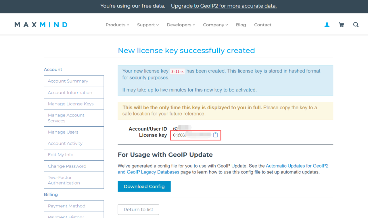 Shlink利用MaxMind的GeoLite2数据库来定位访客,所以我们需要先生成许可证密钥