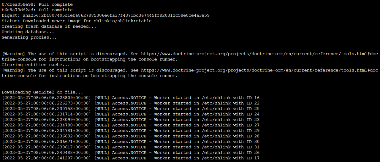 docker run \ --name my_shlink \ -p 25600:8080 \ -e DEFAULT_DOMAIN=yourshlink.com \ -e IS_HTTPS_ENABLED=true \ -e GEOLITE_LICENSE_KEY=Ojf****di****3X0 \ shlinkio/shlink:stable