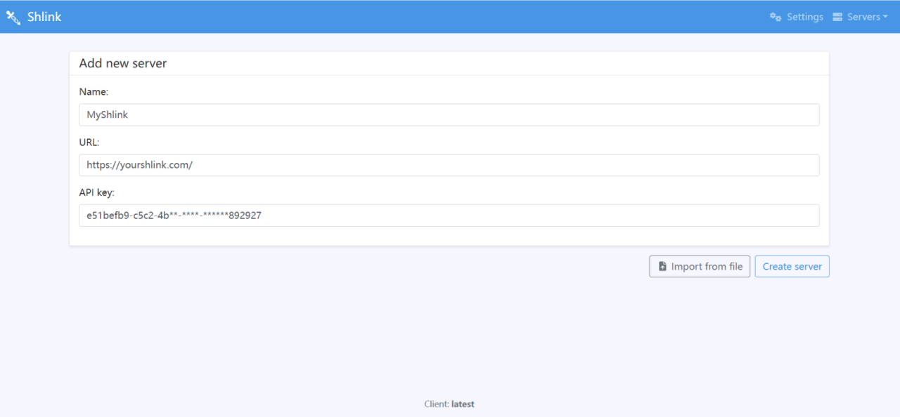 docker run \ --name shlink-web-client \ -p 25601:80 \ -e SHLINK_SERVER_URL=http(s)://yourshlink.com/ \ -e SHLINK_SERVER_API_KEY=e51befb9-c5c2-4b**-****-******892927 \ shlinkio/shlink-web-client