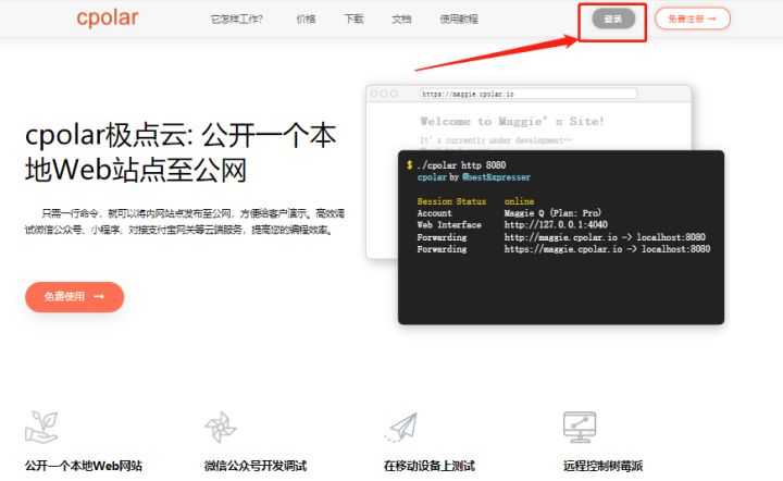 要创建一条固定数据隧道,我们需要从隧道的进口端和出口端两个方面,将漂移的端口固定下来。首先我们转到cpolar官网