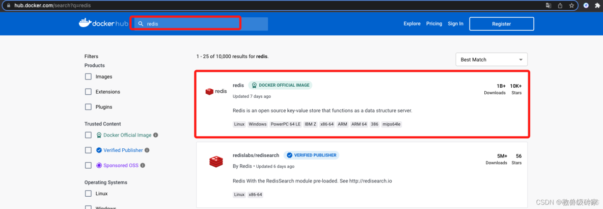 首先获取镜像,访问Docker 在网站中搜索redis关键字,如下图: