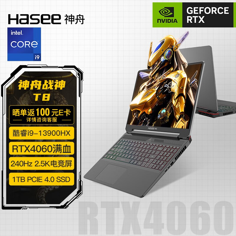 神舟(HASEE)战神T8 13代英特尔酷睿i9 16英寸游戏本 笔记本电脑(13代i9-13900HX 32G 1TB RTX4060 240Hz 2.5K电竞屏)