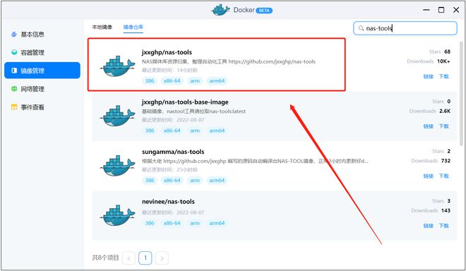 第二步,咱们进入绿联Docker,选择镜像管理→镜像仓库→找到jxxghp/nas_tools→选择版本lastest。