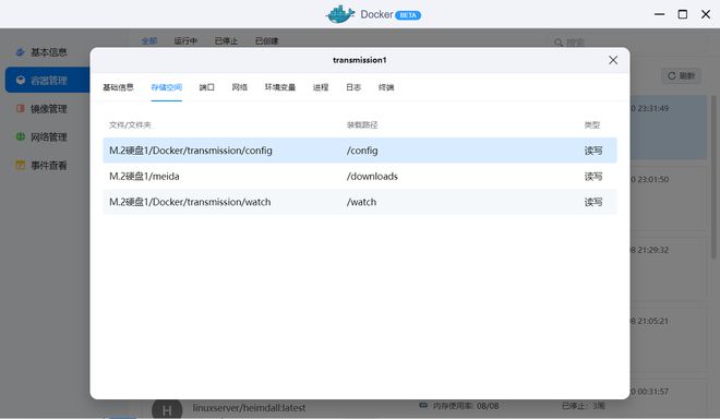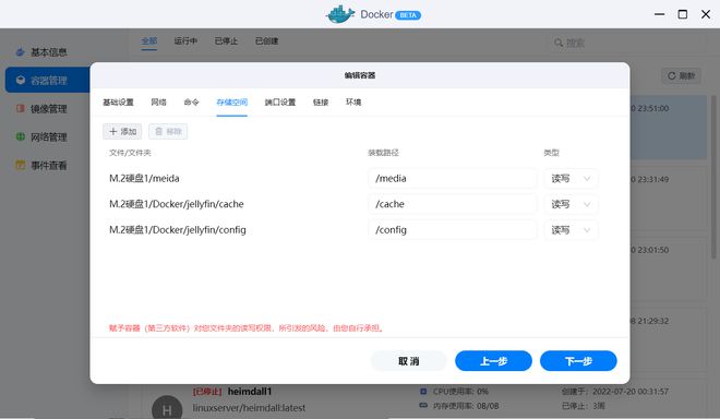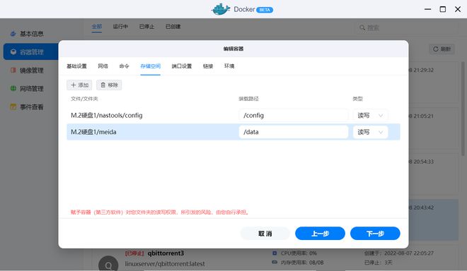 下载完成后再本地镜像里面点击“创建容器”。点击下一步,选择“存储空间”,添加2个文件夹。其中/config是配置文件,/data是选择存放(影音资源)的文件夹。