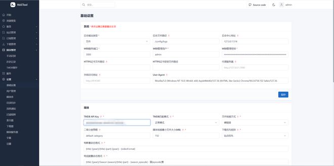 用户名admin,密码password。登陆后打开基础设置,修改WEB管理密码,填入TMDB API密钥 (v3 auth),请注意,如果没有可以申请一个非常简单。