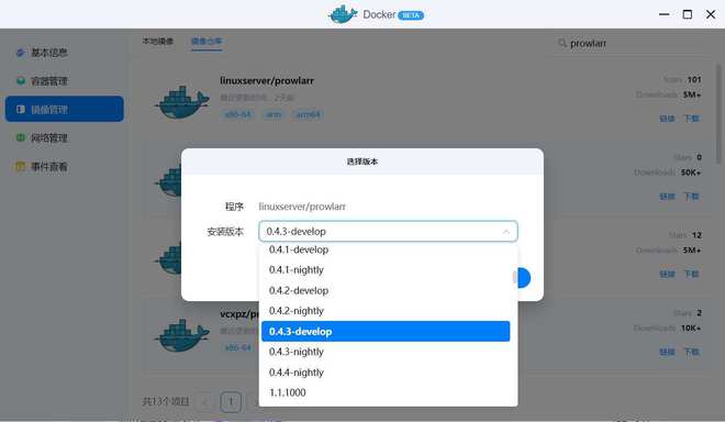 第三步,安装索引工具prowlarr,咱们再次进入Docker容器,安装linuxserver/prowlarr,版本选择“0.4.3-develop”。