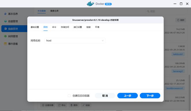 下载完成后,直接点击“创建容器”,网络选择“host”,直接“下一步”,然后完成。