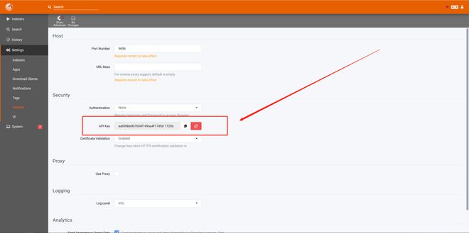 点击Setting→General,复制API密匙,并将其添加到nas-tools索引器设置里。