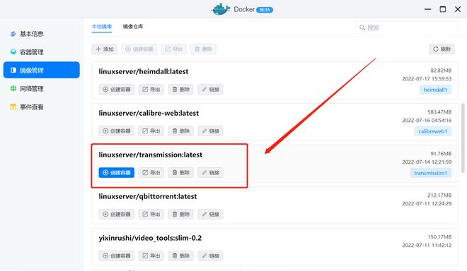 第四步是安装下载工具,首先在镜像仓库搜索transmission镜像,选择支持“linuxserver/transmission”的版本,点击下载即可。然后在本地镜像点击“创建容器”。