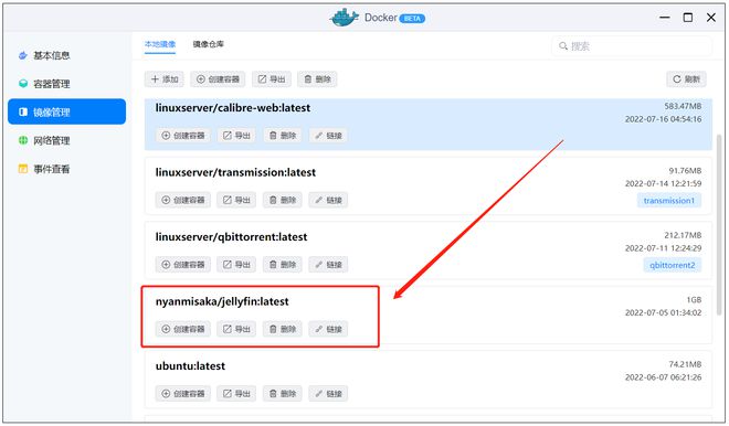第五步,是安装Jellyfin,首先在镜像仓库搜索jellyfin镜像,选择支持“Nyanmisaka/jellyfin”的版本,点击下载,然后进入镜像管理点击“创建容器”。