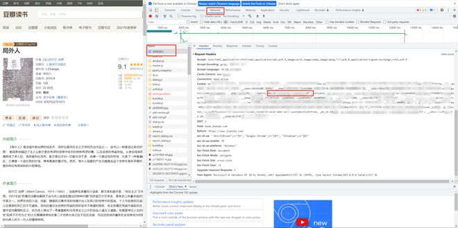 关于豆瓣cookie获取也比较简单,打开豆瓣任意一个书籍条目,按F12键会出来开发者页面,找到network,找到4908885,找到cookie,中间有一个类似于dbcl2=”222850174:jS1eZuld1po”这种格式的就是的。