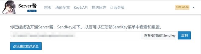 由于企业微信升级了白名单IP制度,目前家庭用户的IP都是动态IP,所以微信推送基本很难稳定使用。所以咱们可以考虑其他的推送工具,如Server酱推送设置,只需要百度搜索Server酱微信扫码即可获取一个SendKey。
