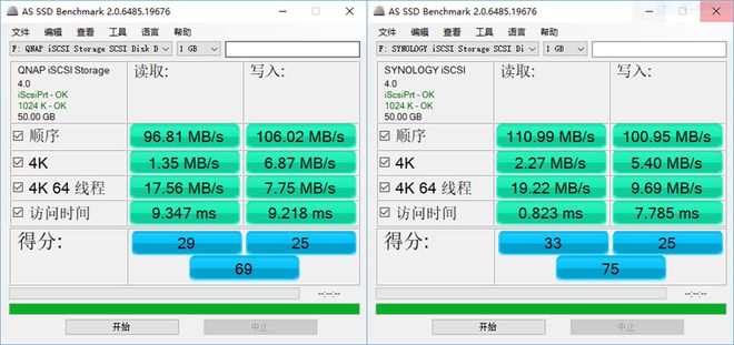 通过测试,两个虚拟硬盘最终的得分差不多,都只有70分左右的水平,而I/O性能也都是在100MB/s左右,这个值也已经接近千兆网络的极限,没办法再进步了。