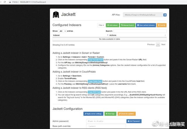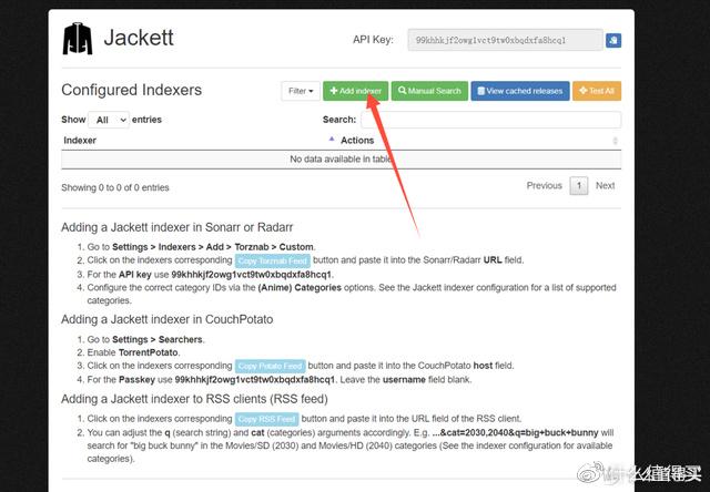 1、安装好以后通过浏览器访问jackett(群晖NASIP:9117)