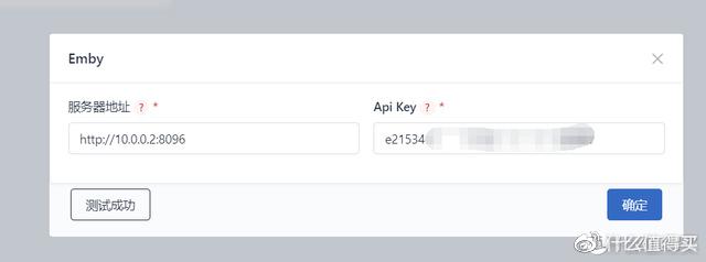 1、点开emby,这里需要配置两个参数服务器地址和EMBY API,然后点击测试,显示测试成功即可,相应获取方式如下