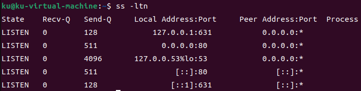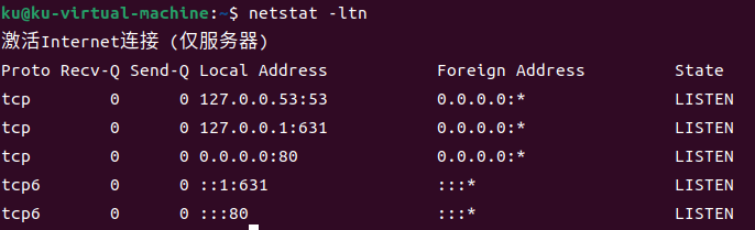 查看监听的TCP连接:ss -ltn;