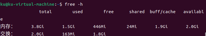查看总体内存和交换空间使用情况:free -h;
