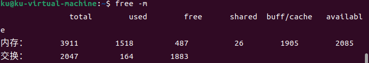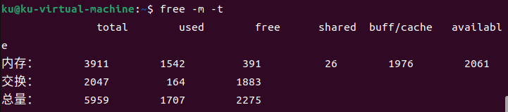 - free命令用于显示系统中的内存使用情况,默认情况下以KB为单位显示结果。