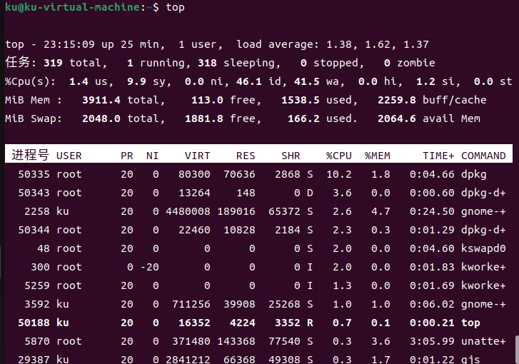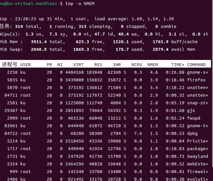 top查看内存占用情况,未排序