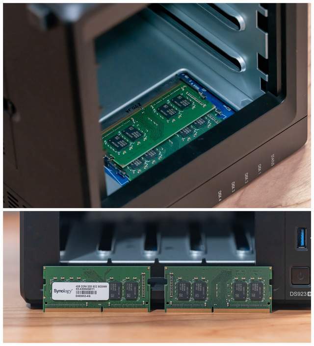 此次 DS923+ 还从 DS920+ 的单内存变成了两根 SO-DIMM 的内存插槽,默认搭载了一根群晖 4GB DDR4 内存条,我正好把群晖 DS1621+ 的标配内存给取下来,组成了 8GB 的双通道内存。