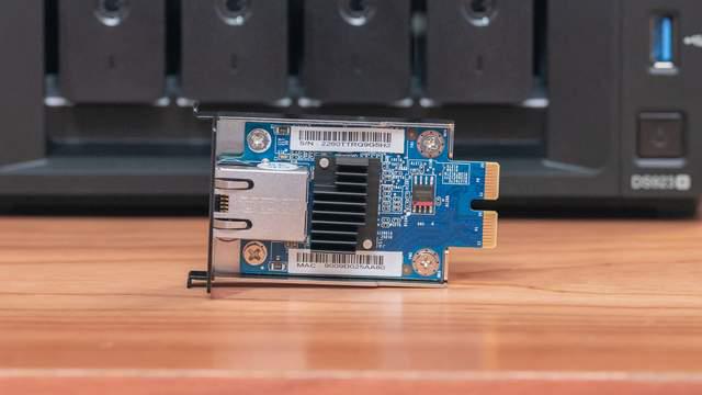 此处就要搭配【群晖 E10G22-T1-Mini 万兆网卡】来使用了,这张非常小巧的拓展卡,使用的便是 PCIe Gen3 × 2 插槽,可以看到内部的主控芯片上还有一个被动式散热。