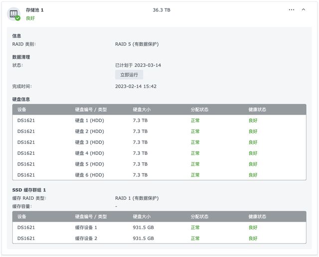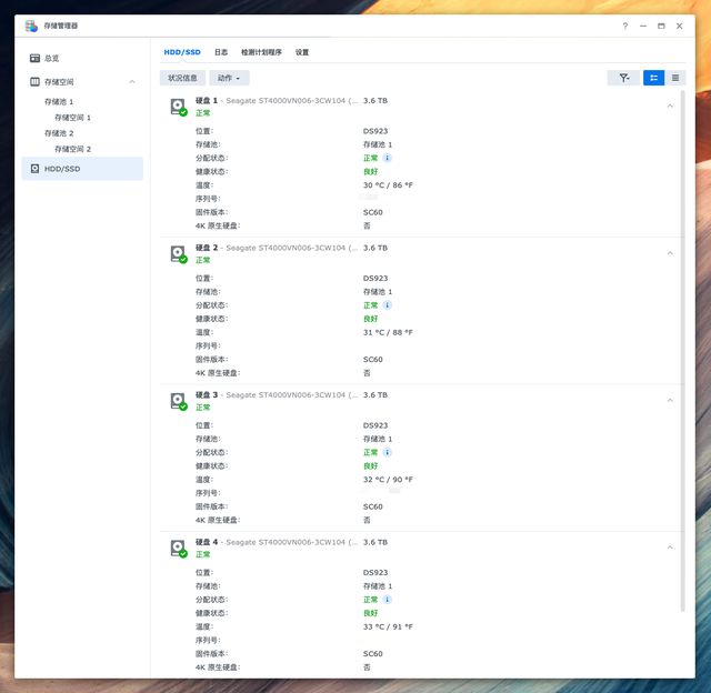 可以看到四个机械硬盘和两个固态硬盘都在存储管理器里面正确识别了,我为了便于管理分成了两个存储池加以区分,但考虑到固态硬盘组的容量有限,所以单独只设置了一个高速读写共享文件夹。