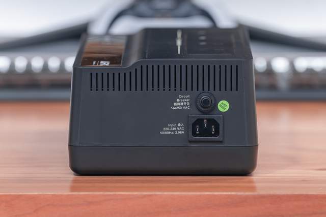在 UPS 的另一面,则是供电线和断路器开关,如果 UPS 发生过载,断路器会弹出一截以此断开市电,起到保护作用,等电压恢复正常你再按压下去即可接通市电恢复工作。