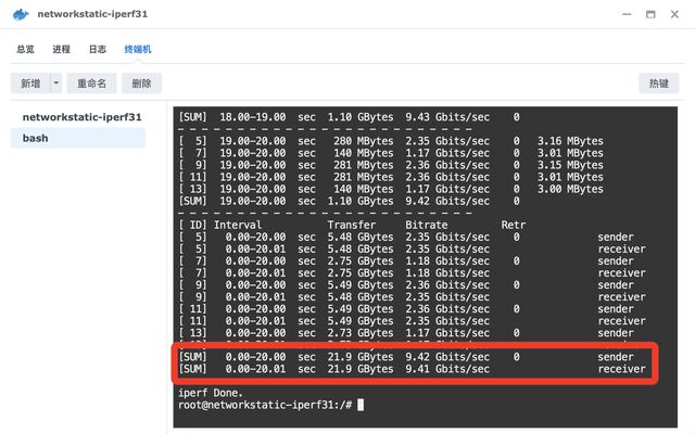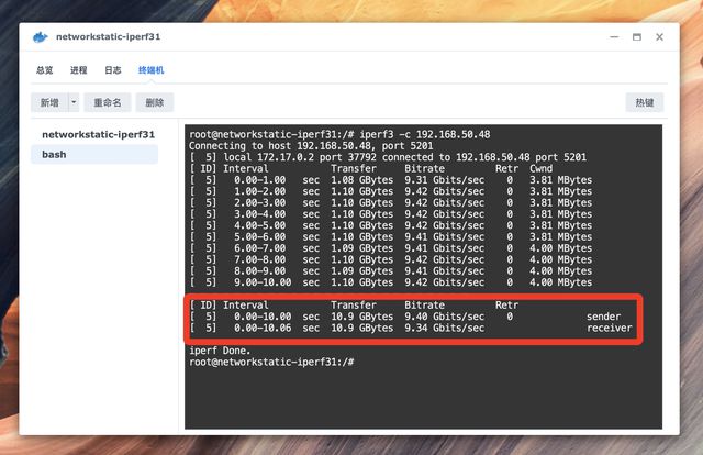 想要测试万兆的带宽能力,主要的工具还是通过 iPerf 3,我们可以在群晖 DSM 系统的 Docker 容器里面下载配置 iPerf3 测试工具。通过 iPerf3 监听,可以看到 DS923+ 与电脑间数据带宽达到了 9.34-9.40Gbps,峰值估计在 1175MB/s。