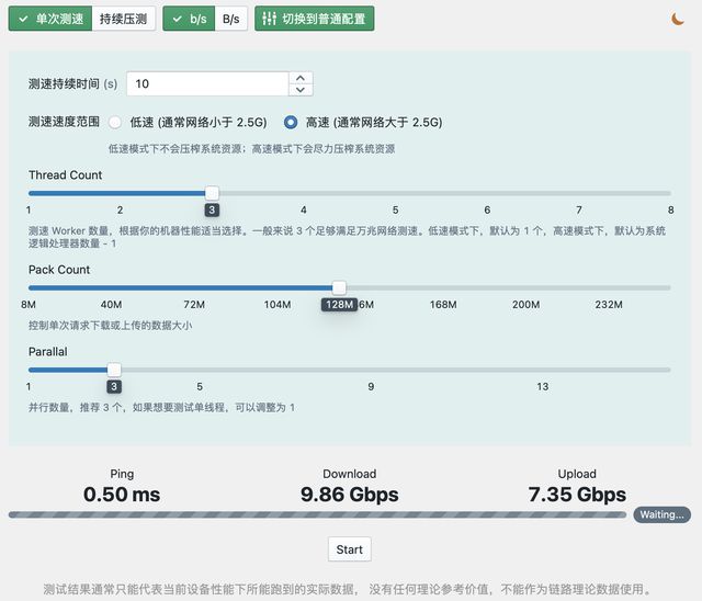 通过「HomeBox」的多线程 128MB 并发测试可以看到,下行速率达到了 9.86Gbps,上行速率达到了 7.35Gbps。