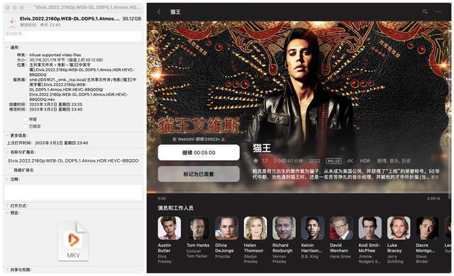 带宽能力决定的是 NAS 的性能上限,而性能下限则是由硬盘决定。为了测试 NAS 的读写性能,我挑选了一个《猫王》的 4K HDR 片源,文件容量为 30.12GB。