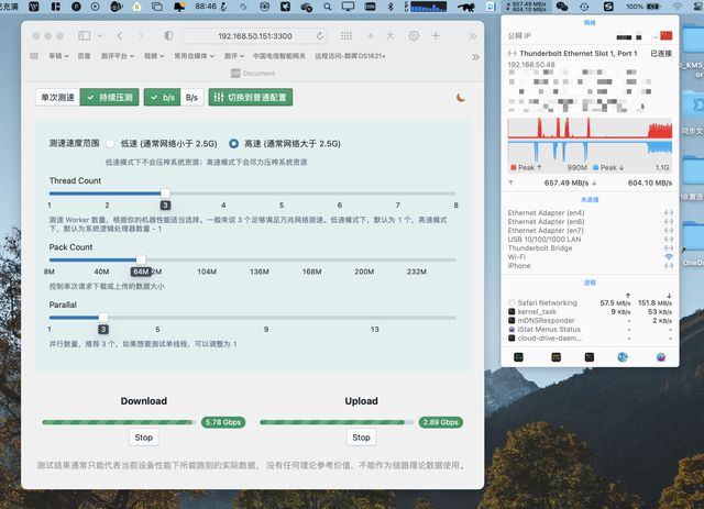 我通过 Homebox 测试 NAS 并发写入和读取的速率,可以看到下行带宽达到了 5.78Gbps,上行达到了 2.89Gbps,总带宽在 8.67Gbps,如果有别的设备同时介入测试,也能从分流到可用的带宽量,至少不会出现打架的情况。如果你希望每个终端的带宽能够满足需求,可以考虑在交换机里面做好进阶的分流设置。