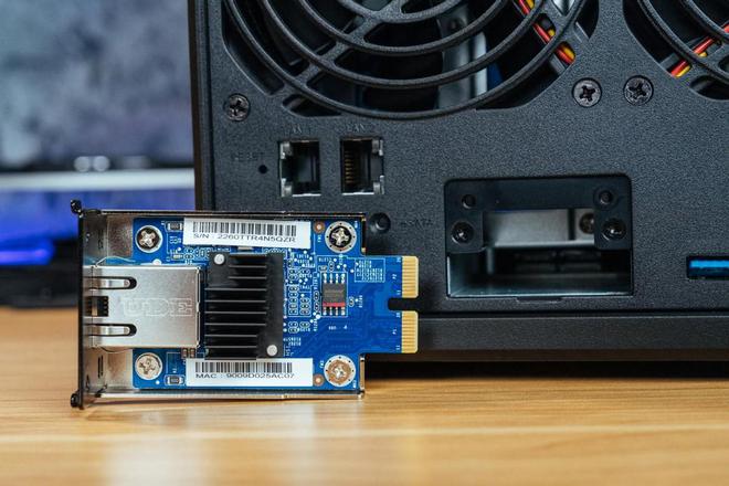 前面提到DS923+支持万兆拓展,就是利用这个网络升级插槽。拆开挡板,就可以插入群晖 E10G22-T1-MINI 电口万兆网卡,可以提供10GbE连接,这样DS923+就能支持万兆网口了。