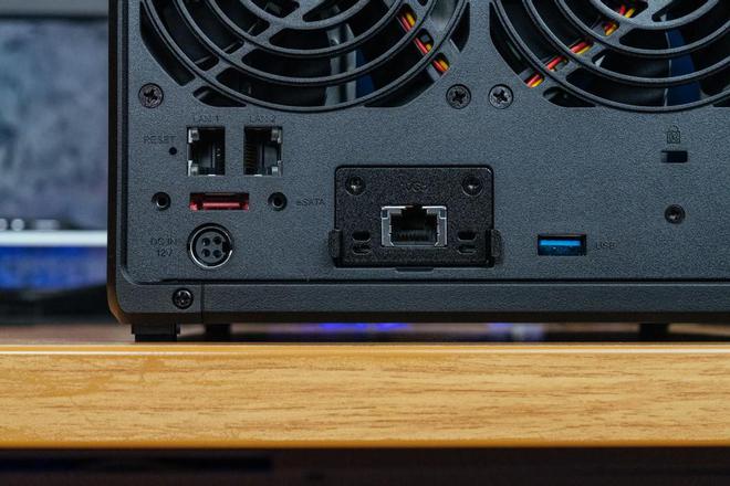 为保证良好的散热效果,DS923+的背部设有两个9cm大风扇。接口方面,配置了一个USB 3.2和一个 eSATA接口、2个1GbE 网口、reset键、电源接口以及网络升级插槽。eSATA接口用于硬盘位拓展,只需要通过eSATA接口将DS923+与DX517相连即可;而2个千兆网口可以通过链路聚合实现最高2Gbps的速率,前提是要有支持链路聚合功能的路由器和交换机。