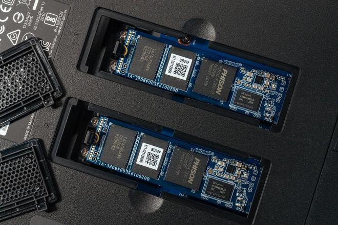 机身底部设置了M.2 NVMe SSD扩展槽,外部盖板同样采用免工具设计,内部设置了两个2280规格的M.2 SSD插槽。