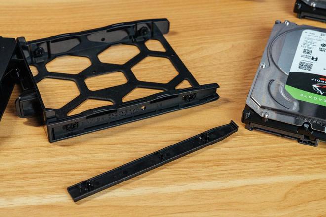 硬盘托盘采用快拆式设计,我使用的是3.5英寸硬盘,将托盘上的卡扣打开,直接放入硬盘,再加卡扣合上即可。如果使用的是2.5英寸固态硬盘,需要使用配套螺丝钉固定安装。