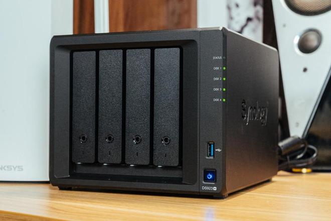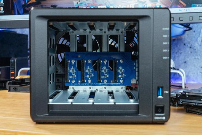 DS923+采用的是四盘位+双M.2设计的机器,布局和DS420+是一样的:盘位右侧是各个状态的LED指示灯,右下角是前置USB3.0接口、开关机键。