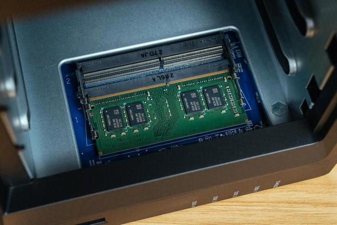 机身内部右侧设置了一个内存扩展插口,预装的是群晖DDR4 3200MHz 4GB ECC内存,如果需求最大支持扩展32GB。预装的是一根ECC支持纠错功能的内存,在内存选择上,带有ECC纠错功能的内存好于普通笔记本内存,在升级内存条的时候优先选择有ECC纠错功能的。