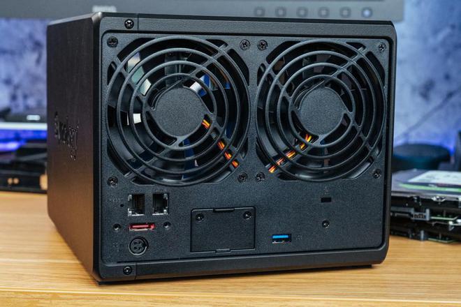 为保证良好的散热效果,DS923+的背部设有两个9cm大风扇。接口方面,配置了一个USB 3.2和一个 eSATA接口、2个1GbE 网口、reset键、电源接口以及网络升级插槽。eSATA接口用于硬盘位拓展,只需要通过eSATA接口将DS923+与DX517相连即可;而2个千兆网口可以通过链路聚合实现最高2Gbps的速率,前提是要有支持链路聚合功能的路由器和交换机。