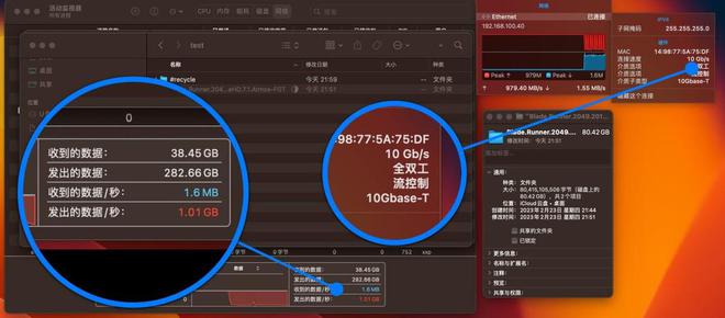 NAS到Mac mini读取速度达到了1.2GB,传输80GB的4K蓝光电影仅需大约1.5分钟,这个速度相比千兆网传输的速度快上N倍,如果有条件的小伙伴可以考虑使用万兆网卡+万兆交换机组件局域网,这样能大大提升与NAS之间的传输速率。特别是摄影&剪辑工作的用户,万兆提升的读写性能,可以满足挂盘实时剪辑视频和处理照片的需求。