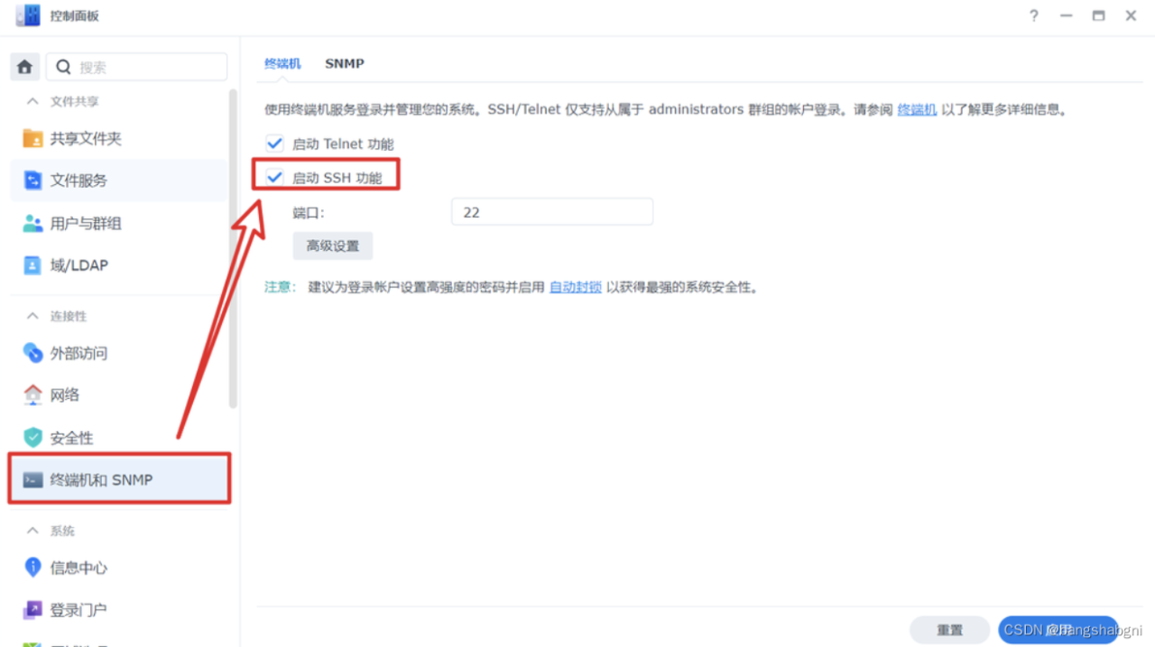 🔺安装是通过SSH终端连接的方式进行的,所以我们需要在【控制面板—终端机和SNMP】里面打开SSH功能。这里再次强调,为了安全,小伙伴们一定要养成不用的时候关闭SSH功能的习惯,很重要!
