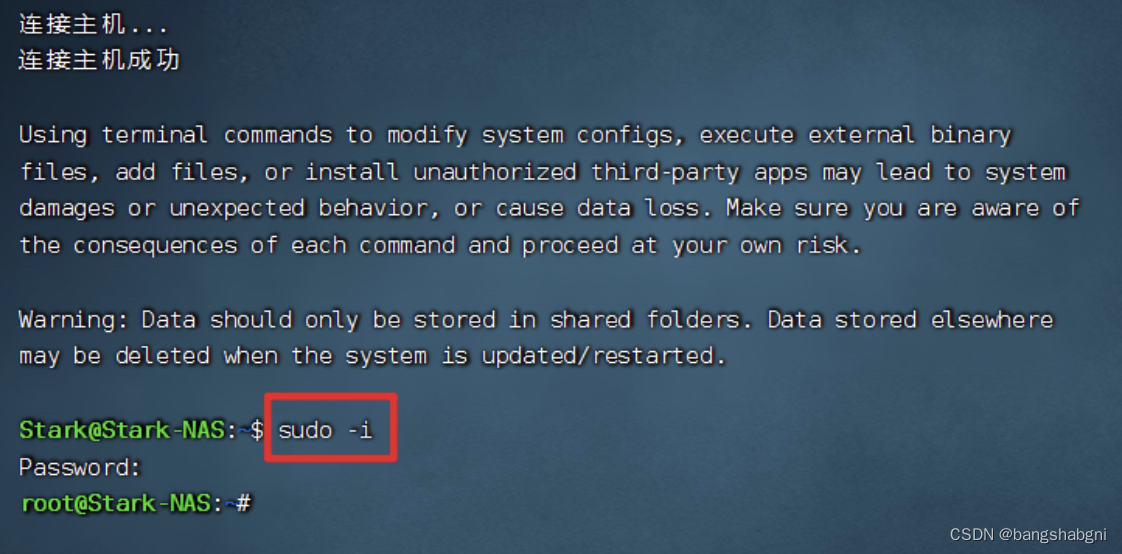 🔺至于怎么SSH连接,你用什么工具SSH连接都随意。连上之后先输入【sudo -i】命令开启管理员模式,回车之后会让我们输入密码。属于密码的时候界面不会显示,输入完成之后直接回车即可。