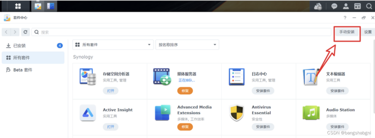 🔺这个时候就可以打开【套件中心】,点击右上角的“手动安装”。