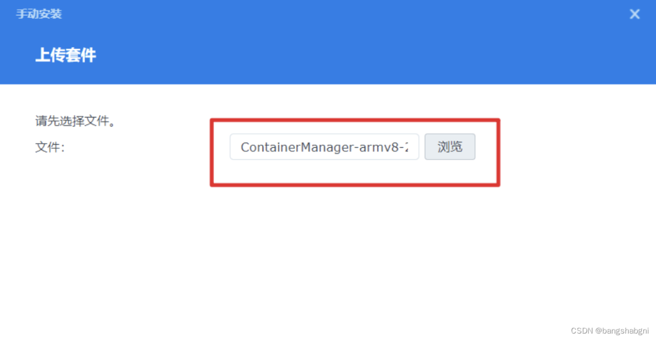 🔺上传我们前面下载的Container Manager (Docker)的离线安装包(也就是那个spk格式的文件),下一步。