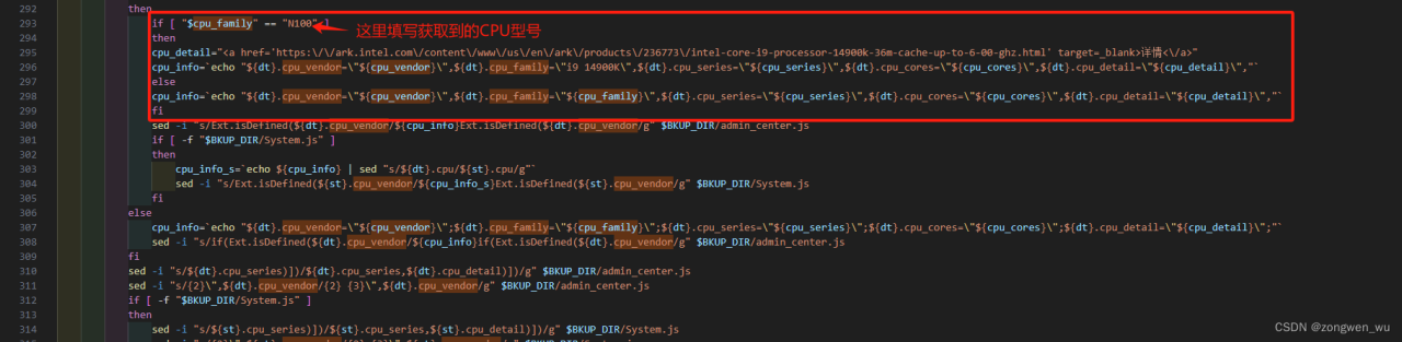 if [ "$cpu_family" == "N100" ] then cpu_detail="<a href='https:\/\/ark.intel.com\/content\/www\/us\/en\/ark\/products\/236773\/intel-core-i9-processor-14900k-36m-cache-up-to-6-00-ghz.html' target=_blank>详情<\/a>" cpu_info=`echo "${dt}.cpu_vendor=\"${cpu_vendor}\",${dt}.cpu_family=\"i9 14900K\",${dt}.cpu_series=\"${cpu_series}\",${dt}.cpu_cores=\"${cpu_cores}\",${dt}.cpu_detail=\"${cpu_detail}\","` else cpu_info=`echo "${dt}.cpu_vendor=\"${cpu_vendor}\",${dt}.cpu_family=\"${cpu_family}\",${dt}.cpu_series=\"${cpu_series}\",${dt}.cpu_cores=\"${cpu_cores}\",${dt}.cpu_detail=\"${cpu_detail}\","` fi