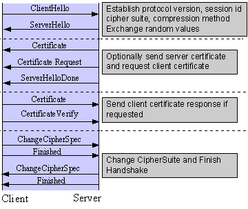 客户机和服务器同构一种“握手”次序来建立SSL会话,如图1.这个握手次序可能会有所不同,这取决于服务器是否配置成提供服务器证书,或者需要客户机提供客户证书。虽然在其他情况下存在因对密码管理要求不同而不同的“握手”步骤,详见各种SSL协议规范,但本文总结了一个基本的握手次序。