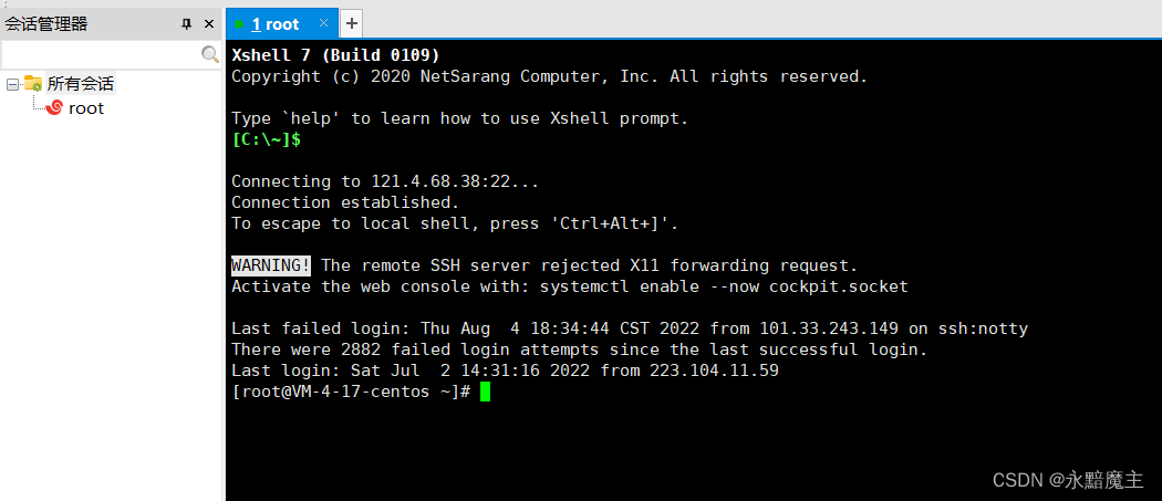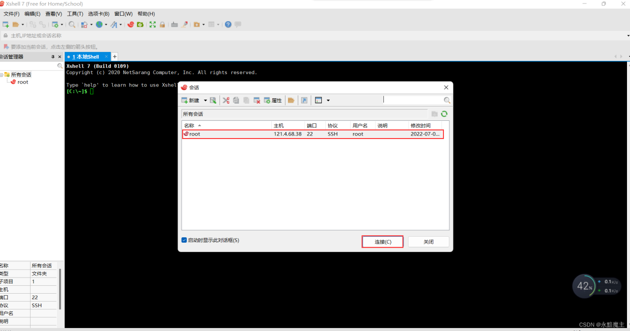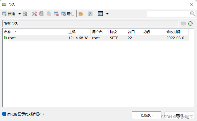 因为的是使用过了的,所以打开就能看到已经存在了一个root会话,刚使用的时候是需要新建会话的,按照提示输入购买的云服务器主机号和密码就好,会话名称这里,我习惯是和账户名一样,也可以是未命名或者其他名字。