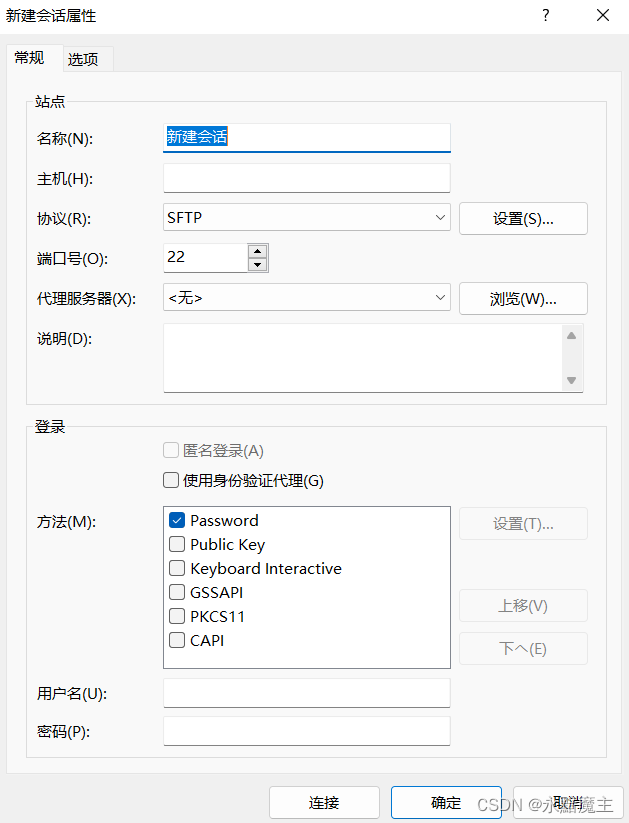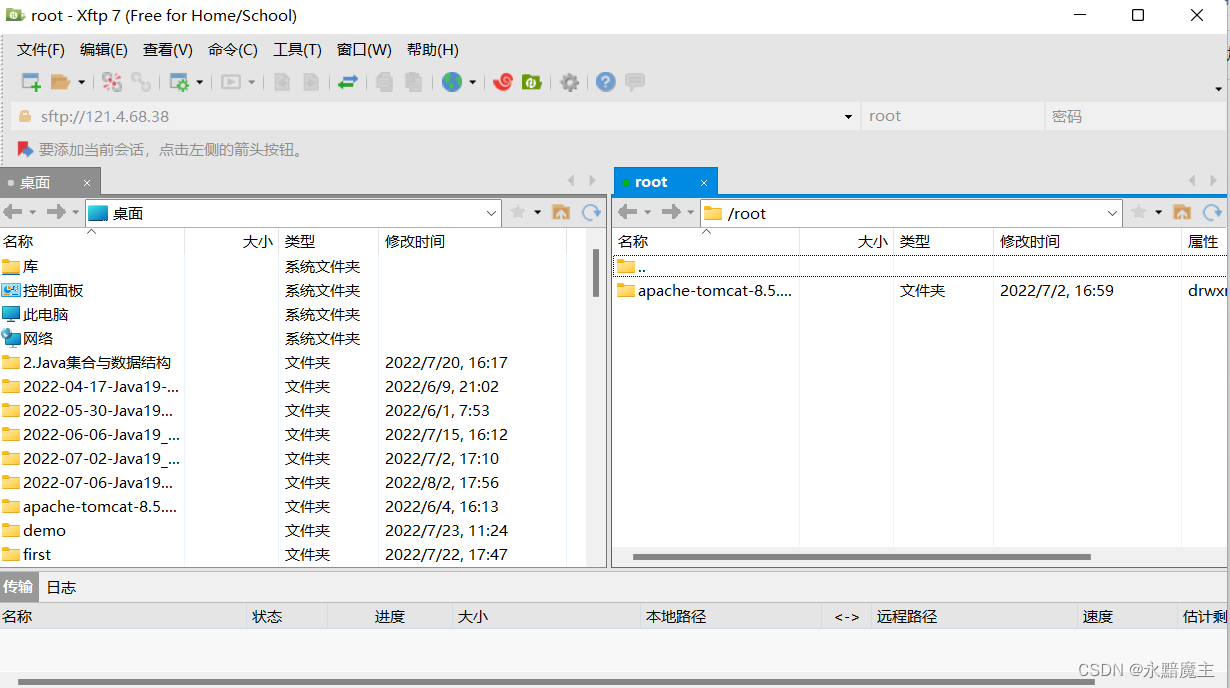 同样的,打开xftp也是需要新建会话,需要输入服务器ip,密码,端口号(默认22)。