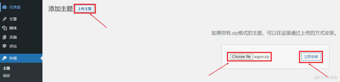 点击安装主题后,选择”上传主题”,然后选择文件,选中下载的argon.zip。然后点击”立即安装”。