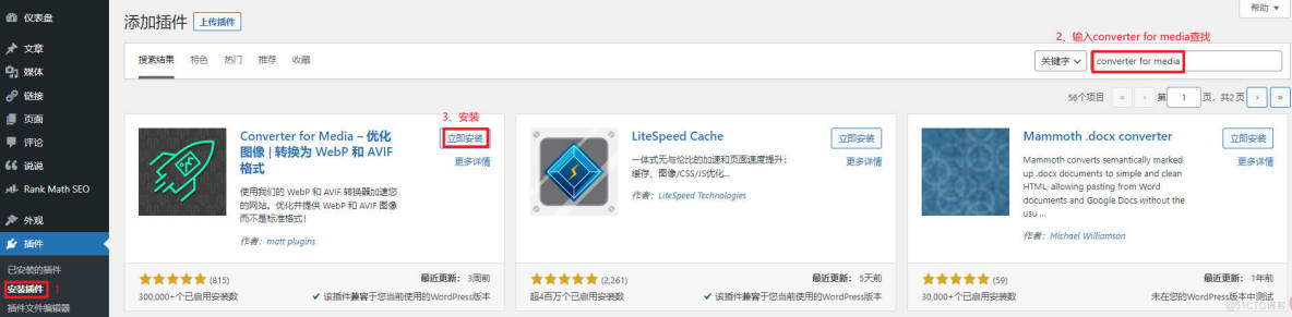 在WordPress后台,点击插件–安装插件,搜索”Converter for Media”插件安装并启用。